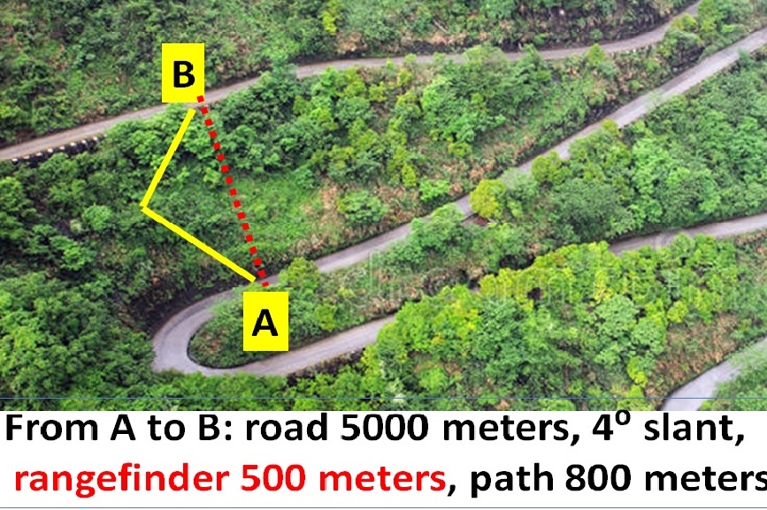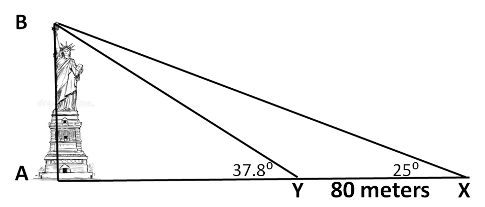 क्रूज़ इस लंबे सप्ताहांत में, जॉनी ने अपनी माँ से पूछा कि क्या वह उसे और उसकी प्रेमिका सैरा को स्टैच्यू ऑफ़ लिबर्टी देखने के लिए ले जा सकती हैं । वह खुशी-खुशी राजी हो गई । सैरा ने इसके लिए अपने दादी से भी अनुमति ले ली । उन्होंने क्रूज़ पर जाने का निर्णय किया । जॉनी ने पूछताछ की और पता चला कि वह अपनी बाइक को नाव पर ले जा सकता था । उसे यह विचार पसंद आया । सैरा अपने पिता के सेक्स्टेंट को भी साथ ले गई । नाव पल भर के लिए रुक गई वे उस नाव में थे जो लोगों को स्मारक का नज़ारा देने के लिए क्षण भर के लिए रुकती थी । नाव मूर्ति के सामने थी । जॉनी और सैरा नाव की नीचली मंज़िल में पीछे की ओर गए जहां सैरा ने मापा कि ज़मीन से मूर्ति के शीर्ष तक का कोण 25⁰ था । तुरंत, वे स्थिर नाव के सामने वाले भाग में चले गए । जॉनी ने अपनी बाइक पर नापा कि वे 80 मीटर चल चुके हैं। अब सारा ने कोण को 37.8⁰ मापा । जब वे घर आए, तो जॉनी ने यह चित्र बनाया जिसमें पहला कोण (XAB) नाव के पिछले भाग में बिंदु X पर और दूसरा (YAB) बिंदु Y पर मापा गया था । X और Y 80 मीटर दूर थे । सैरा: बता दें कि Y की दूरी d मीटर थी। तब AX . d + 80 मीटर होगा । यदि मूर्ति की ऊंचाई h मीटर थी, तो h/d = tan 37.8⁰ और h/(d +80) = tan 25⁰ । जॉनी: मैंने ऑनलाइन जाँच की कि tan 37.8⁰ = 0.775 और tan 25⁰ = 0.466 । इसका मतलब है कि h/d = 0.775 और h/(d+80) = 0.466, d/h = 1.29 ........... समीकरण 1, और (d+80)/h = 2.15....... समीकरण 2. समीकरण 1 को समीकरण 2 से घटाने पर प्राप्त होता है 80/h = 2.15 - 1.29 = 0.86 या 80 = 0.86 h या 93 = h । सैरा: अरे, अब तुम एक त्रिकोणमिति विशेषज्ञ हो । उन्होंने हमें क्रूज पर जो पुस्तक दी थी, उसमें कहा गया है कि स्टैच्यू ऑफ़ लिबर्टी ज़मीनी स्तर से 93 मीटर ऊंची है । जॉनी को ऊंचाई मापने के लिए त्रिकोणमिति का उपयोग करने के अपने नए पाए गए कौशल्य पर मान था । जॉनी और सैरा का माउंटेन चैलेंज जॉनी और सैरा घुमावदार रास्ते वाले पहाड़ पर गए । वे चित्र में दिखाए गए स्थान A पर थे और B स्थान पर जाना चाहते थे । जॉनी: मैं कल A से B तक घुमावदार सड़क पर अपनी बाइक पर गया था । सड़क वाले मार्ग से 5 किलोमीटर दूरी थी और सड़क का औसत झुकाव 4⁰ था । सैरा: तो उस की ऊंचाई है 5000 sin (4⁰) = 5000 x 0.07 = 350 मीटर । सैरा ने अपने पर्स से छोटा रेंज फाइंडर निकाला और मापा कि A से बी B बीच की दूरी 500 मीटर थी । जॉनी: तो A से B arcsin (350/500) के कोण की वृद्धि पर है, arcsin (0.7) है 44⁰ की चढ़ाई । सैरा: चढ़ाई बहुत खड़ी है । हमारी सड़क पर 5 किलोमीटर चलने में ही भलाई है । जॉनी: हम सीधे ऊपर की बजाय बाईं ओर चल सकते हैं और फिर अपने गंतव्य तक पहुंचने के लिए आधे रास्ते के बाद दाएं की ओर मुड़ सकते हैं । सैरा आश्वस्त हो गई । वे दिखाए गए मार्ग पर चलते हुए बिंदु B पर पहुंच गए । जॉनी: मेरे फिटनेस माप से पता चलता है कि हम 800 मीटर चले । सैरा: तो इसका मतलब यह होगा कि हम arcsin (350/800) या arcsin (0.4375) के कोण पर चले । मेरे कैलकुलेटर से पता चलता है कि यह 26⁰ का कोण होगा जो 