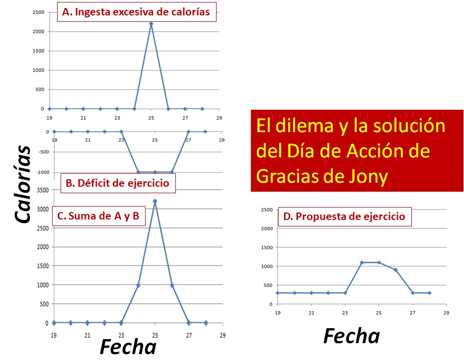 Sr. Max: Este año, el Día de Acción de Gracias es el 25 de noviembre. Aquí están los gráficos para (A) el exceso de ingesta de calorías, (B) el déficit de ejercicio y (C) la suma de A y B. He hecho los gráficos a partir de noviembre 19.