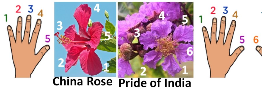 Aunt Flora: Yes, it is a Mustard Flower and has four petals. Look the picture also shows 1,2,3,4 on the fingers. Next is a hand with all the fingers being counted one, two, three, four and five. It is called China Rose.