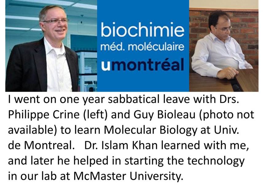 I took a sabbatical leave to work with Drs. G. Bioleau and P. Crine at Universite de Montreal in 1988-89. The purpose was to learn molecular biology. For one year, I took an accommodation in Montreal. I would work there for 2-3 weeks at a time and come to McMaster to look after my McMaster lab for 2-3 days. The expenses were paid by McMaster University, CIHR, Univ. De Montreal and FRSQ. I also had a postdoctoral fellow with me. The two of us learned molecular biology together and cloned the cDNA for calcium pumps in the smooth muscle. The postdoc returned with me in my lab for two more years and helped me start this direction of our research work.