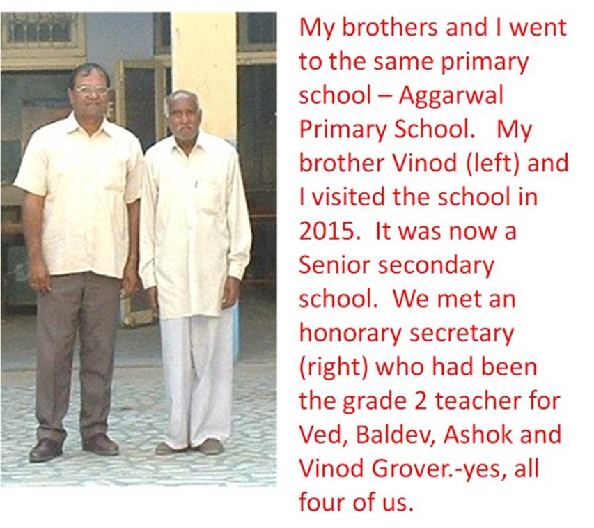 Our father chose academically good schools for us. These were government aided school. In Jagadhari, I attended the Aggarwal Primary School until grade 4. It was interesting that my three brothers went to this school and that all of us had the same teacher in grade 2. I learned Hindi and some Punjabi in grades 3 and 4.
