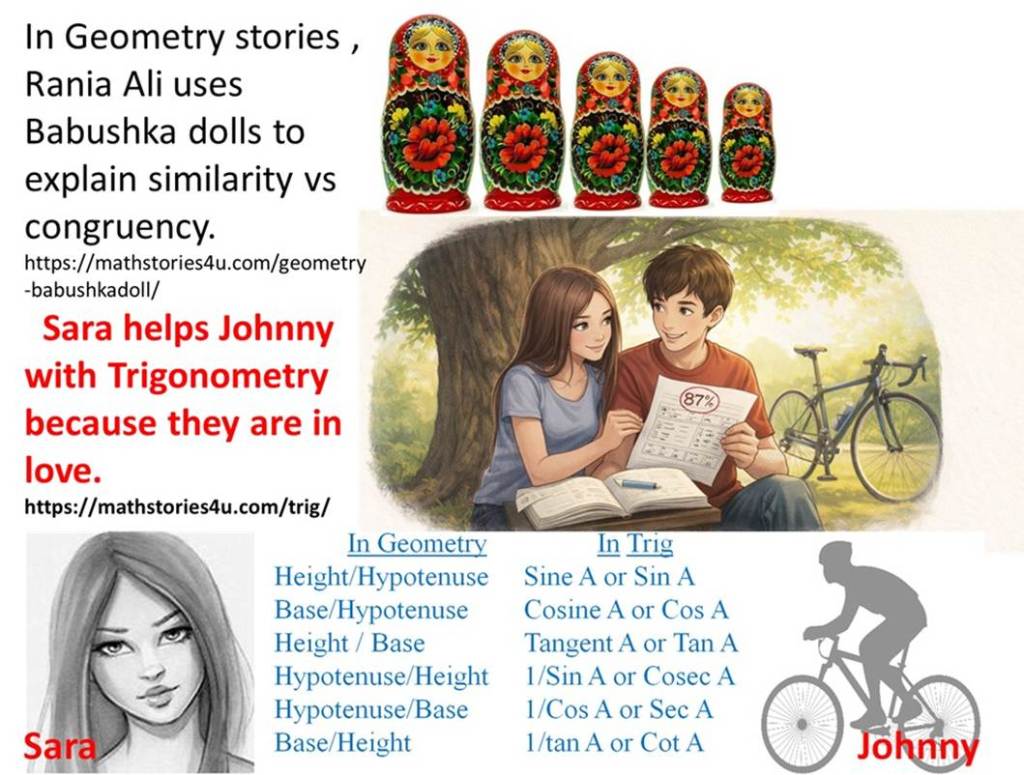 Inspired by Sameer’s interests, I spent three to four years writing math stories. The goal was to get students interested in the subject. The first story was a teenage romance novel about Sara and Johnny. Johnny wanted a fancy bike; his father agreed to pay for it only if Johnny scored 85% or higher in trigonometry. Sara made sure that he did. Their romance continued through to calculus, while Sara also helped several friends with algebra.