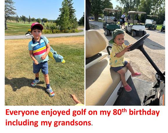 The annual lab golf game tradition started for my birthday in 1995 continued for 25 years. Covid 19 and our move to Ottawa killed this tradition for 2021 onwards. I stopped going to a golf course but put a net in our driveway making my own driving range. It was decided that we should celebrate my 80th birthday with a golf game. The student who had started this tradition in 1995 was excited. My two high school classmates, several students from McMaster, family and local friends participated. We all enjoyed the day. Watch the video (https://www.youtube.com/watch?v=it7PB1_YfM0&t=2s). There are rumours that the celebration will be repeated on the next birthday. I will let you know if it happens.