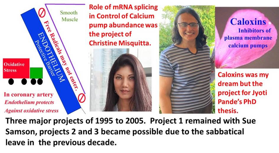 I continued with my CHIR and HSFO funded projects. The CIHR project was now focused on the structure of RNA encoding the calcium pumps. We also did some work on iron transport. There was a major change in the HSFO project. We observed that oxidation preferentially damaged the coronary artery internal calcium pump over the one on the cell surface. The artery has a loose layer of cells called endothelium on the inner surface and then the smooth muscle layer starts. This oxidative damage was less on the endothelium than in the smooth muscle of the artery. This led to the idea that the endothelium played a role in protecting the muscle layer against oxidative damage. The oxidative stress induced damage to the coronary artery became the focus of our research. It also included transport of Vitamin C into and out of different cell types in the coronary artery.