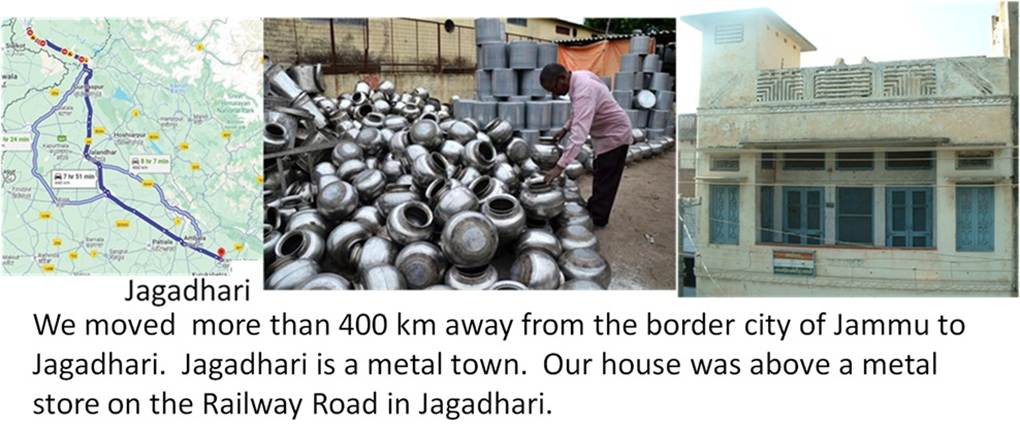 Our family migrated away from the border city of Jammu. We were fortunate refugees who did not end up living in tents. We lived briefly in Ambala and then in Jagadhari. Both were then in Indian Punjab but are now in the state of Haryana. In Jagadhari alone we moved four times. Our father made several attempts at making a living. It was paradoxical. We had a low income and yet finally lived in a large house belonging to a relative. Jagadhari was a small metal city where kids from neighboring agricultural villages came to study. My parents encouraged them to study with my brothers, sleep at our place during exam days, and sometimes even fed them despite our low income.