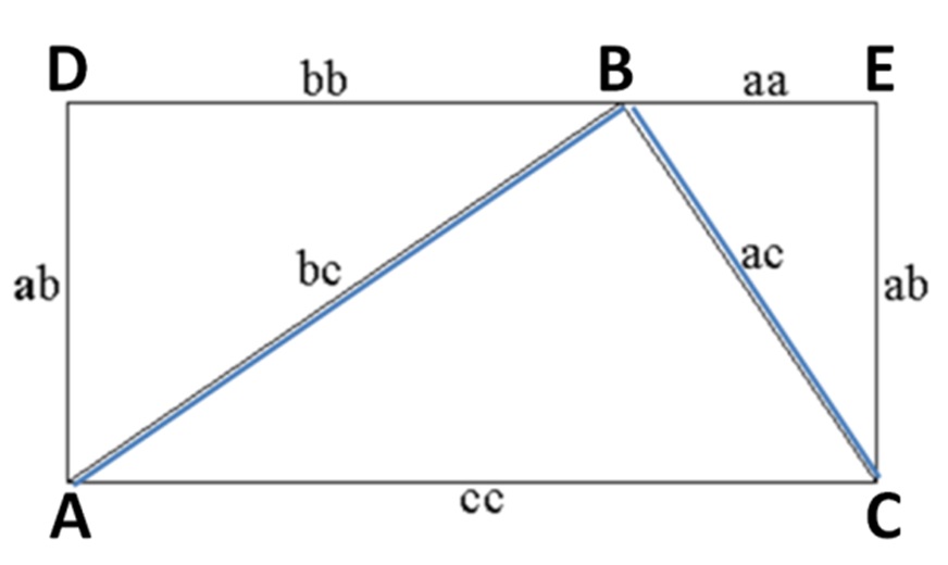 and another right ∠ Δ BCE of the hypotenuse BC of length cc and sides BE and CE lengths aa and ab.
