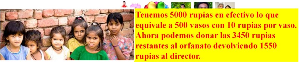 Tinku: Peter y yo contamos que tenemos Rs. 5000 en efectivo. Esto es consistente con la venta de 500 vasos de limonada cada uno a Rs. 10. Ahora podemos devolver Rs. 1550 al principal. Eso deja una ganancia Rs. 3450 para donación al orfanato.