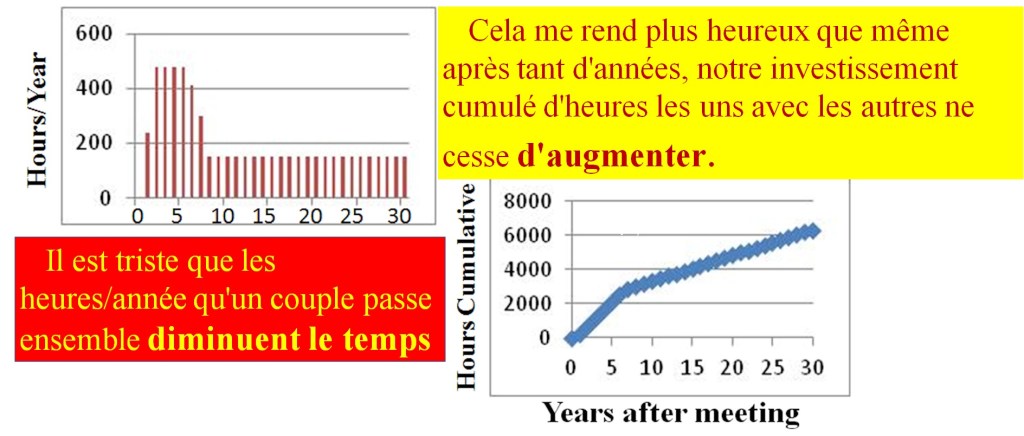 Sara : Maintenant, regardez la deuxième photo. Il est basé sur la première image. Il montre le nombre total d’heures qu’ils ont passées ensemble dans leur relation. Comme vous pouvez le voir, ce nombre continue d’augmenter même 30 ans après leur rencontre. Ce qui compte, c’est combien de temps vous passez du temps ensemble dans votre vie plutôt que par an ? Vous devriez être heureux que ce nombre continue d’augmenter.