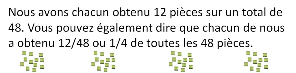 Chetan : J’en reçois un quart. Cela signifie que je reçois 48 x 1/4 = 48/4 = (12 x 4) /4 = 12 chocolats.