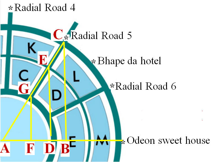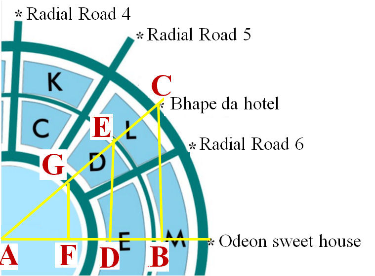 Tanya : Le chiffre suivant ne concerne que la zone couverte aujourd’hui. Sur cette image, une ligne droite AB a été tracée de Central Park à Odeon sweet house où nous avons commencé à enregistrer notre mouvement. Une autre ligne AC a été tracée du centre à Raidal Road 6. De C, j’ai une ligne CB verticale à AB. Parce que d’Odeon sweet house à Radial Road 4 forme un quart d’un cercle qui est de 90°, et la rotation jusqu’à Road 6 est d’un tiers de cela, l’angle BAC est de 30°. Selon mon téléphone intelligent, nous avions déménagé à 175 mètres au nord (ligne BC) d’Odeon sweet house. Toujours selon cette carte AC est de 350 mètres.