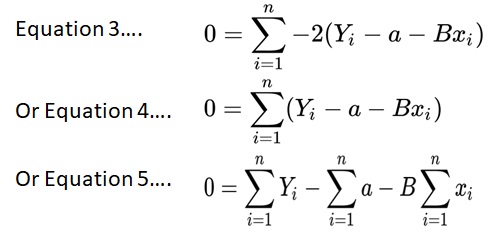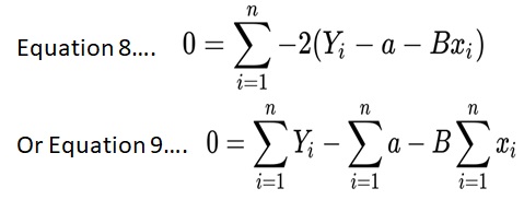 Maintenant, la somme de toutes les valeurs de a de 1 à n est na, et a = (Yi signifie -B signifie xi). Par conséquent, nous pouvons écrire les équations 10, 11 et 12.