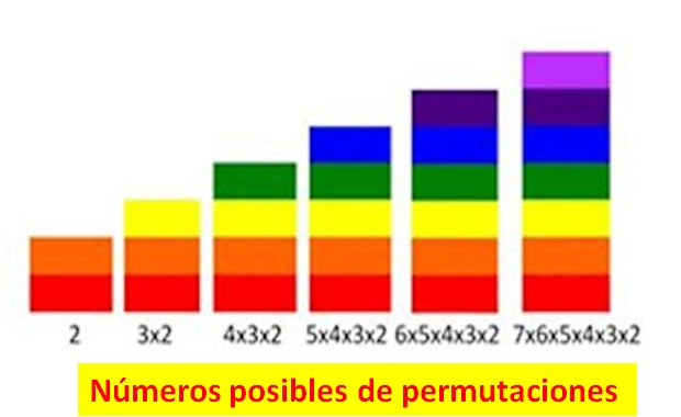 Todos queremos mochilas de diseño similares pero únicas: nadie más en la escuela debería tener exactamente el mismo patrón. Sabes qué, no es un problema. Si tiene dos colores, puede tener cualquier color en la parte superior y el otro en la parte inferior. Entonces, hay dos arreglos posibles. Con tres colores, hay 3 posibilidades de qué color va en la parte superior, y para cualquier color en la parte superior, puedes obtener dos arreglos diferentes como te acabo de mostrar. Obtienes arreglos totales de 3 x 2. Con cuatro colores, cualquier color de los cuatro puede estar en la parte superior con arreglos propios de 3 x 2 y así sucesivamente. Entonces tienes un total de 4 x 3 x 2 arreglos posibles. Esta imagen muestra el número de arreglos para 5, 6 y 7 colores también. A partir de 7 rayas rojas de color, se pueden hacer 7 x 6 x 5 x 4 x 3 x 2, que son 5040 patrones diferentes.