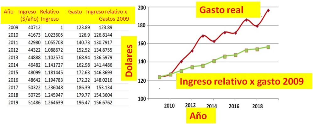 Ingreso relativo gasto corregido = 121.652 x 1.024622 (número de años después de 2009)