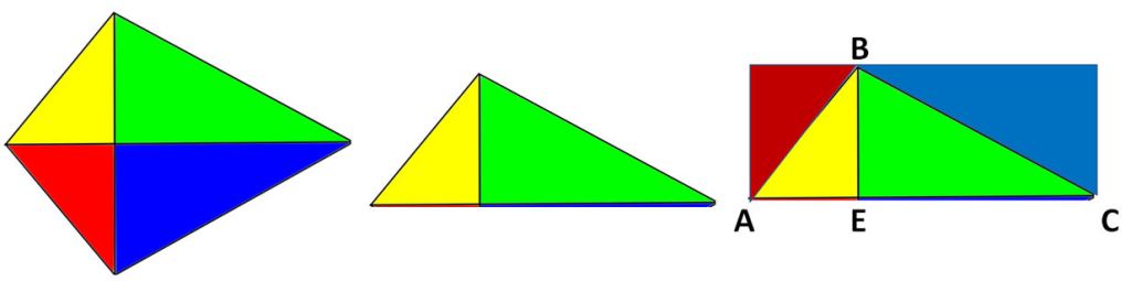 Taheen: Me quedé con la mitad superior de su cometa. Luego volteé el triángulo rojo y lo pegué en el lado izquierdo. Luego también volteé el triángulo azul y lo pegué en el lado derecho. De esta manera, hice un rectángulo con su cometa, con la base AC y la altura BE. El área de la cometa es AC x BE, que es lo mismo que largo x ancho original (BD)/2, pero creo que esto es más sencillo.