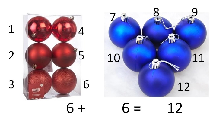 Los colgaron y luego Joey contó con los dedos. Tenían 6 bolas rojas y luego 6 más. Contó 7, 8, 9, 10, 11 y 12. Eso significaba que tenían 12 bolas en total.