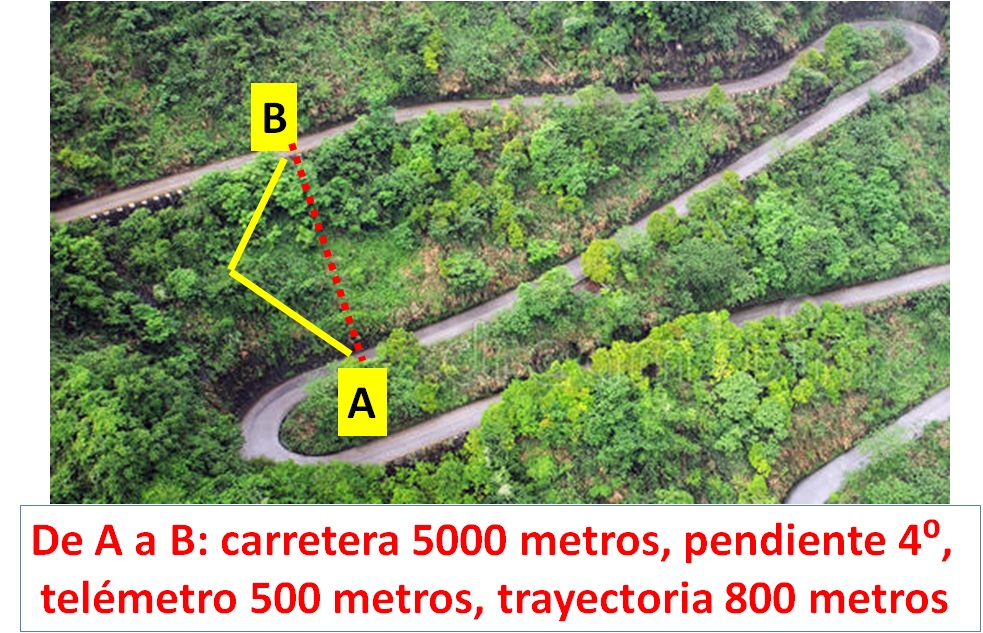 Johnny: Fui en mi bicicleta por el sinuoso camino de A a B el otro día. Fueron 5 kilómetros por carretera y la inclinación media de la carretera fue de 4⁰.