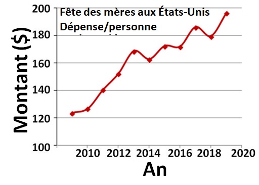 Sara : Laissons-le tranquille. J’ai lu hier qu’aux États-Unis, les dépenses moyennes pour la fête des mères ont augmenté au cours de la dernière décennie. Voici un graphique qui le montre. Bien que je n’aie pas tracé de ligne lisse reliant les points, il pourrait s’agir d’une ligne droite avec une pente positive. L’image suivante montre les données. La dépense moyenne par personne pour la fête des mères était de 123,89 $ en 2009 et devrait être de 196,47 $ en 2019. Il s’agit d’une pente de 6,60 $ par année au cours de ces 11 années. En moyenne, les dépenses pour la fête des mères augmentent chaque année de ce montant.