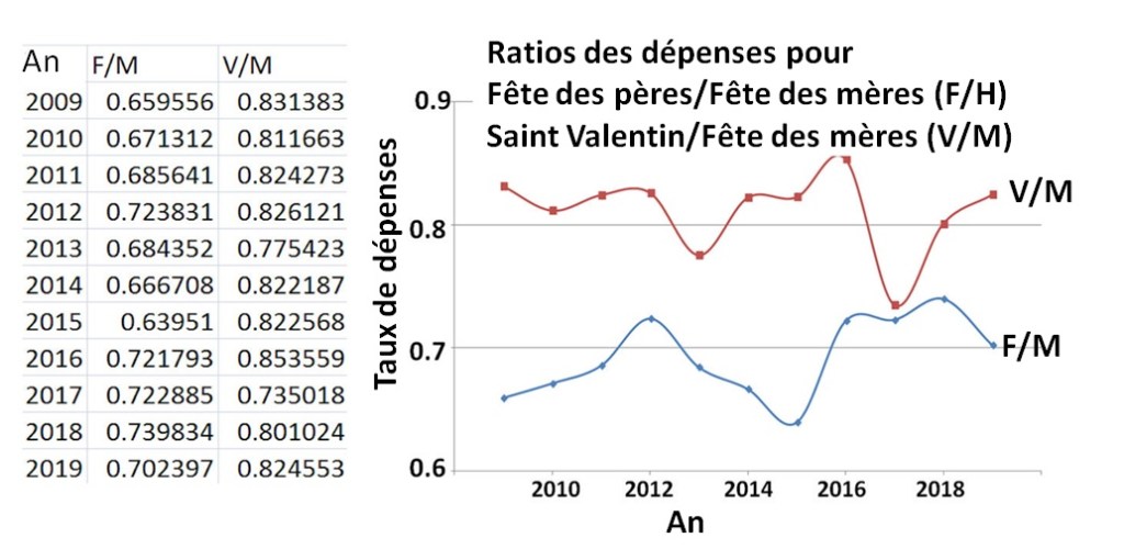 Sara dit que pour chaque année, vous pouvez calculer le rapport entre les dépenses de la fête des pères et celles de la fête des mères et voir s’il y a une tendance dans ce rapport. Vous pouvez également faire la même chose pour la Saint-Valentin.