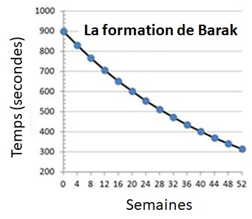 Ayesha : Si nous continuons à faire cela, dans 52 semaines, votre temps sera de 315 secondes, ce qui est bien meilleur que les 360 secondes (6 minutes) dont vous avez besoin. Le professeur de mathématiques a même fait ce graphique pour moi (voir photo de la formation de Barak). Bien sûr, je suppose que vous continuerez à travailler avec moi.