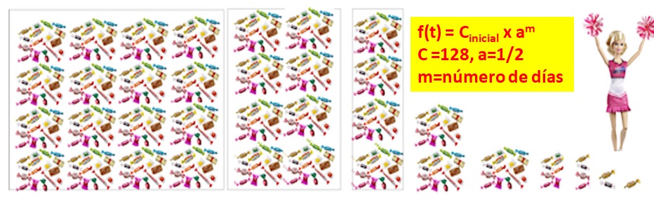 f(t) = Cinicial x 2(- número de semanas) = Cinicial x 2(-7 x número de días). Así conseguí los números que le di después del día de los enamorados.