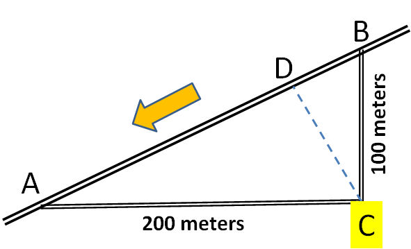 J’ai dit que c’était simple à comprendre. Nous tirons CD de notre hôtel perpendiculairement à la route de parade AB. Ensuite, nous pouvons tout calculer.