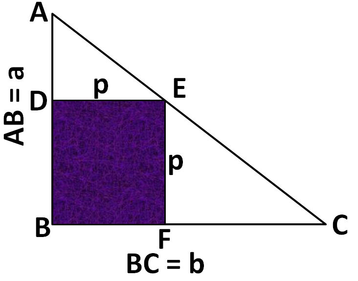 Les côtés du triangle rectangle ABC sont AB = a et BC = b. Un carré avec un bras de p y est inscrit comme indiqué. Comment p est-il lié à a et b ?
