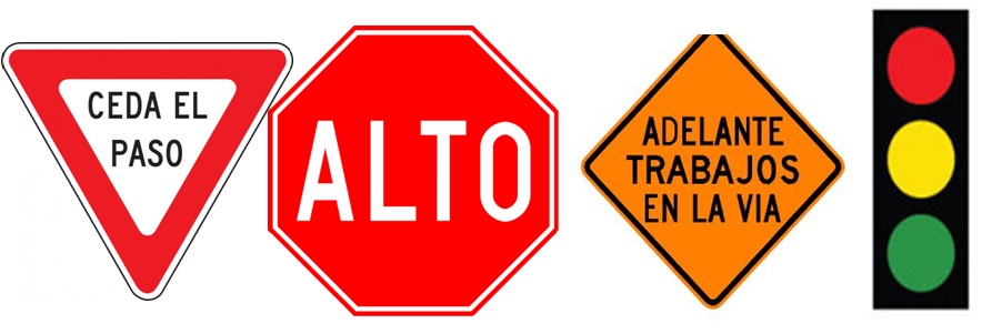 Estas son algunas de las señales que ves en el camino. ¿Cuál es el número de lados en las formas de la señal ceda el paso, alto y adelante trabajos en la via. Cuáles son las formas de la luz roja, la luz amarilla y la luz verde? No se ha proporcionado ninguna solución a este desafío.