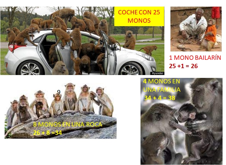 La primera foto era un carro con 25 monos. Ella nunca había visto nada como esto. Luego le mostró una foto de un mono bailando. Eso hizo un total de 25 + 1 = 26 monos.