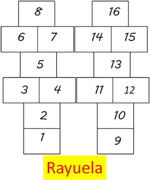 Cuenta en el juego de la rayuela todos los lugares diferentes a los que puedes saltar. Súbete a todos ellos dos veces y cuenta tus saltos.
