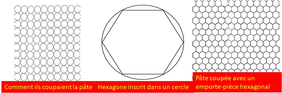 Mani : Ici, je dessine un cercle et à l’intérieur se trouve l’hexagone. D’un coin à l’autre l’hexagone est aussi grand que le cercle mais en réalité il n’utilise que 82,7% de la pâte par rapport au cercle. Vous économiseriez 17,3% de matériel et personne ne remarquerait la différence de taille.