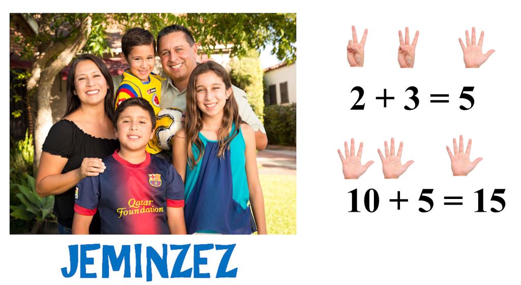 Emily: La siguiente casa pertenece a la familia Jeminzez que también tiene 5 personas. Así que supongo que dirías que debo contar 5 números más 11,12,13, 14 y 15 para decir que hay 15 personas en las tres casas.