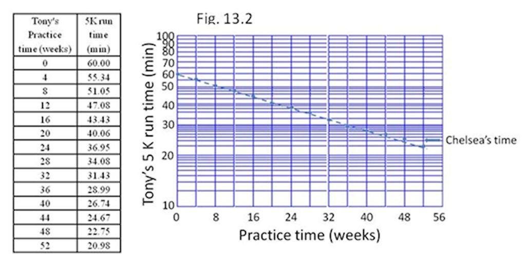 Solution : Tony a couru le 5 km en 60 min le week-end. Après chaque semaine, il prendra 2% de temps en moins que la semaine précédente. Par conséquent, le temps après n semaines sera de 60 x (1- 0,02)n ou 60 x 0,98n. Afin d’obtenir une ligne droite, Tony a dû tracer le temps d’exécution de 5 000 sur une échelle logarithmique. Il a obtenu un papier semi-logarithmique à cycle unique et a représenté graphiquement les données comme indiqué. Clairement, il a battu le temps de Chelsea de 22 minutes comme le montre le graphique avec une flèche.