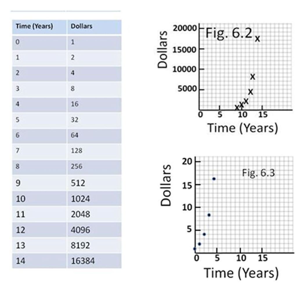 Tout d’abord, j’ai utilisé un papier quadrillé normal et tracé le nombre d’années sur l’axe des X et les montants en dollars sur l’axe des Y. J’ai réglé l’axe X de 0 à 14 et l’axe Y de 0 à 20 000. Les points pour Y supérieur à 1000 pouvaient être marqués facilement mais il était difficile de savoir où marquer les points pour de très petites valeurs de Y. J’ai changé l’échelle Y en partant de 0 et en terminant à 20. Maintenant, je pouvais facilement marquer le points jusqu’à 16 mais il n’y avait pas d’espace pour les points avec les valeurs les plus élevées. J’étais frustré en pensant qu’aucune échelle ne tiendrait compte de tous les points.