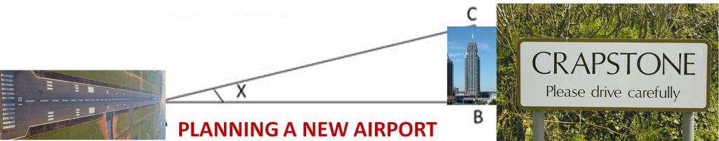 La ville de Crapstone ne possède pas d’aéroport et souhaite en concevoir un sur le seul terrain qui lui est disponible au nord de la ville. Une piste ne peut pas être conçue dans le sens est-ouest en raison de nombreux problèmes géographiques et, par conséquent, une piste nord-sud doit être envisagée. La ville compte plusieurs immeubles de grande hauteur à 3 kilomètres de l’extrémité sud de la piste possible – le plus haut mesurant 100 mètres de haut. Le nord de l’aéroport est hors de question à cause d’une montagne. Serait-ce un problème étant donné que l’angle de descente lors de l’atterrissage est de moins 3° et que l’angle de montée est prévu à 8° ?