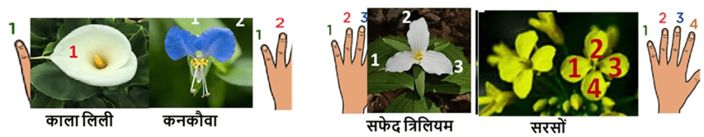 पुष्पा बोली: सफेद ट्रिलियम में 3 पंखुड़ियाँ होती हैं और सरसों के फूल में 4 ।