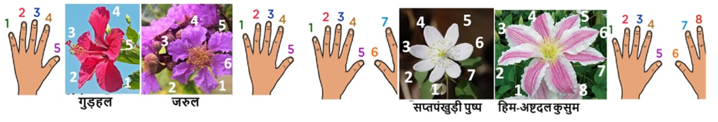 पुष्पा बोली: नहीं, सभी फूलों में पंखुड़ियाँ होती हैं। उसने मुझे अलग-अलग संख्या की पंखुड़ियों वाले फूल बनाना सिखाया है। चलो, हम एक खेल खेलते हैं। तुम उँगलियों पर गिनो और मैं उतनी ही पंखुड़ियों वाले फूल की तस्वीर दिखाऊँगी।