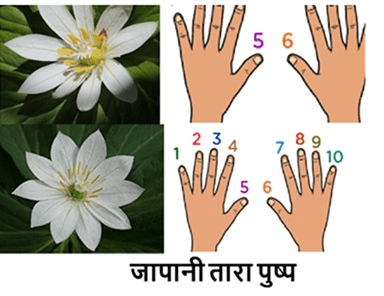 पुष्पा बोली: जापानी तारा पुष्प की कुछ किस्मों में 9 पंखुड़ियाँ होती हैं और कुछ में 10 ।