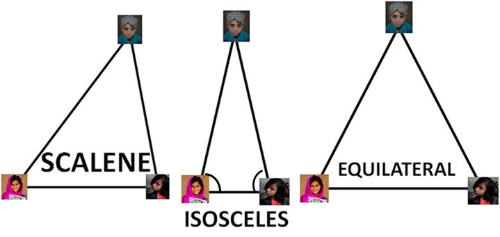Mme Ali : Classe, arrêtez de rigoler. Les trois vont vous apprendre les différents types de triangles. Voyez-vous une relation dans la distance entre Mehak et Arisha, Arisha et Rehan ou Rehan et Mehak.