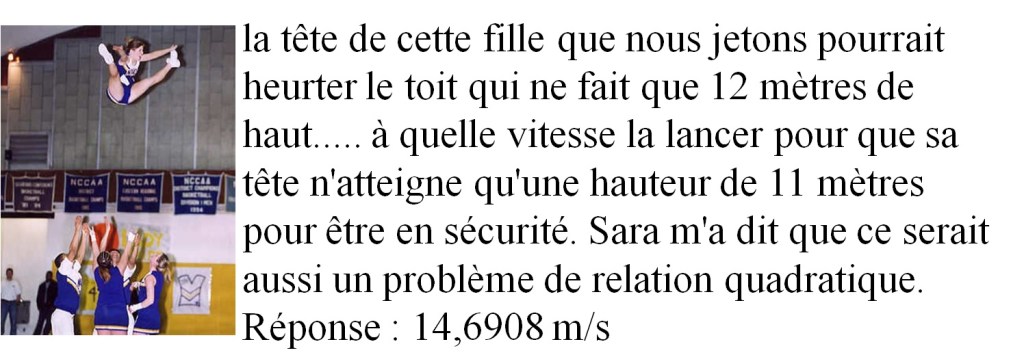 Le problème de Kim : Nous faisons une acclamation de lancer de panier. Nous jetons une petite fille en l’air et nous l’attrapons tous. Si on en jette un tout petit peu, tout le monde hue. Si nous lançons très vite, nous avons peur que la tête de cette fille ne heurte le toit qui ne fait que 12 mètres de haut. Donc, je dois déterminer à quelle vitesse la lancer pour que sa tête n’atteigne qu’une hauteur de 11 mètres pour être en sécurité. Sara m’a dit que ce serait aussi un problème de relation quadratique.
