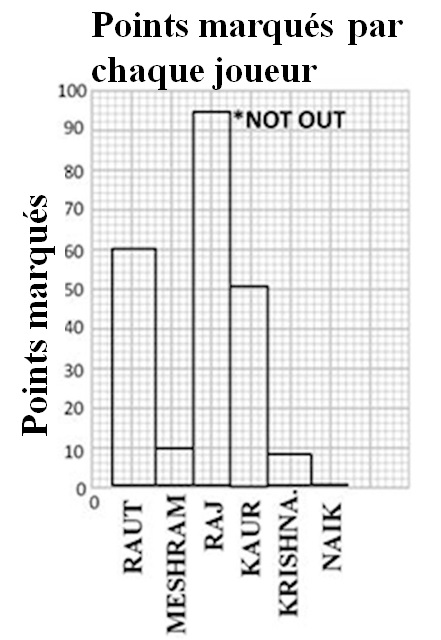 Tous les quatre ont compris le papier millimétré ensemble (voir le graphique à barres pour les points marqués par chaque joueur). Ils ont décidé que Tanya devrait tout écrire sur le papier parce que sa mère lui avait confié cette tâche. Les noms des joueurs ont été mis dans l’ordre où ils sont venus au bâton. Après que Tanya ait tout écrit, la performance de Mathali Raj semblait la meilleure mais Manal avait une suggestion. Elle a indiqué que la photo devait refléter que Raj n’était pas sorti. Peut-être qu’elle aurait marqué même un siècle mais elle ne l’a pas fait car elle avait déjà battu l’équipe d’Angleterre. Alors ils ont mis une étoile et une note de pas sur le graphique.