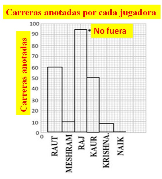 Los cuatro calcularon juntos el papel cuadriculado (vea el gráfico de barras para las carreras anotadas por cada jugador). Decidieron que Tanya debería escribir todo en el papel porque su madre le había dado esta tarea. Los nombres de los jugadores se pusieron en el orden en que llegaron al bate. Después de que Tanya escribió todo, la actuación de Mathali Raj parecía la mejor, pero Manal tenía una sugerencia. Indicó que la imagen tenía que reflejar que Raj no estaba fuera. Puede que hubiera anotado hasta un siglo pero no lo hizo porque ya le había ganado a la selección de Inglaterra. Entonces pusieron una estrella y una nota de no salir en el gráfico.