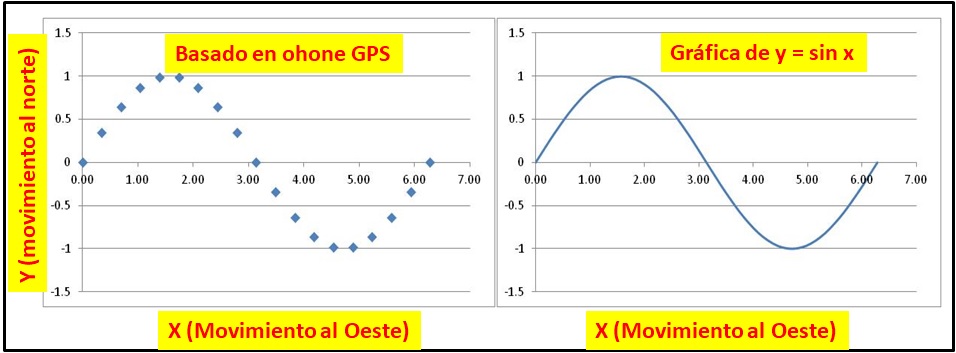 Sara: Aquí hay una parte de esta ola que grabé. Este es solo un gráfico que muestra nuestro avance hacia el oeste en el eje horizontal y el movimiento hacia el norte o el sur en el eje vertical. Oh, cambié un poco la escala para que el total de kilómetros hacia el Oeste resulte ser 2π (igual a 6.28).