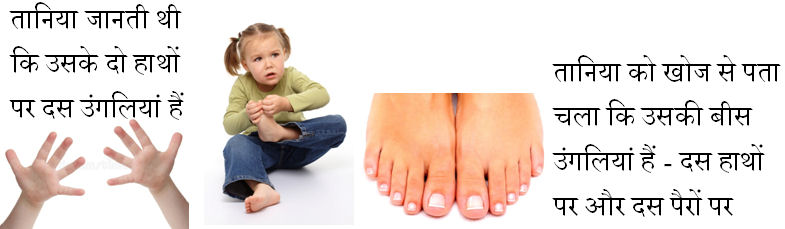 तान्या जानती थी कि उसकी एक नाक, दो आँखें और दो हाथ हैं। वह यह भी जानती थी कि उसके दोनों हाथों में दस उँगलियाँ हैं। तान्या की खोजें जारी रहीं।