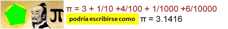 Ahora, la ecuación π = 3 + 1/10 +4/100 + 1/1000 +6/10000 podría escribirse como π = 3.1416