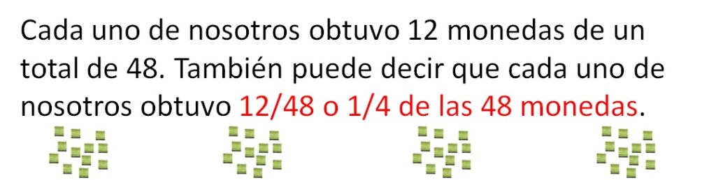 Tanya: Sí, y Peter estaba tomando más pepinos ingleses. Dejando eso de lado, cada uno obtuvo 12 piezas de un total de 48. También podría decir que cada uno de nosotros obtuvo 12/48 o 1/4 de fracción de todas las 48 piezas. Tinku, ¿estás satisfecho con los números ahora? Puede ser que usted pueda escribirlos.