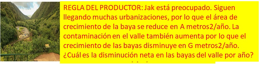 “Jack recolecta bayas silvestres del valle de Tinka y luego las vende en la ciudad para ganarse la vida. Está preocupado. Cada año siguen apareciendo muchos desarrollos de viviendas en el valle, por lo que el área A para el crecimiento de la baya disminuye al ritmo de dA/dt metros cuadrados por año. Al mismo tiempo, la contaminación en el valle aumenta cada año, por lo que el crecimiento G por kilómetro cuadrado de las bayas en la naturaleza disminuye a una tasa de dG/dt por año. ¿Cuál es la tasa neta disminución en las bayas disponibles para la recolección del valle?”