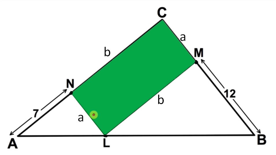 ABC est un triangle rectangle, ∠ACB étant un angle droit. Dessinez un rectangle de côté NL parallèle à AC et ML parallèle à AC tel que L touche AB. Soit les segments de droite AN de 7 unités de long et BM de 12 unités. Déterminer l’aire du rectangle.