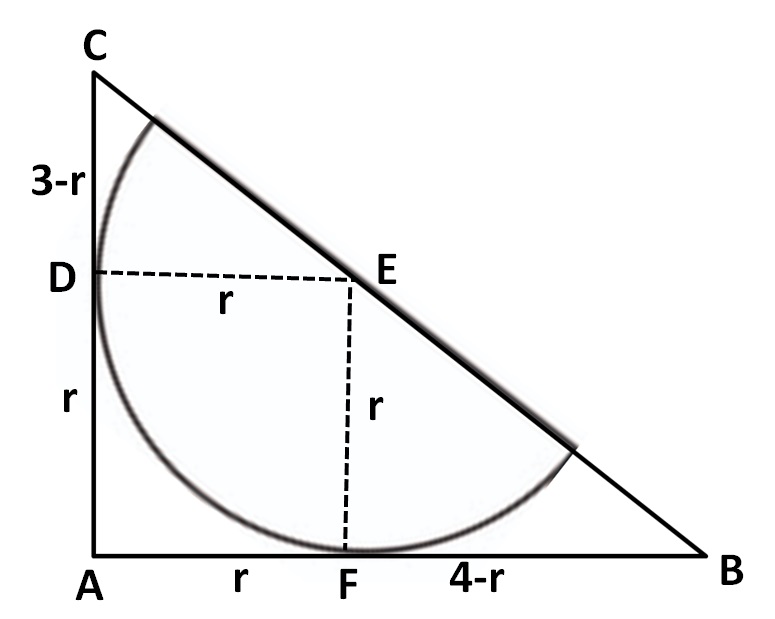 Soit le rayon r. Alors DE = AF et EF = AD = r. Aussi FB = 4-r et CD = 3-r.