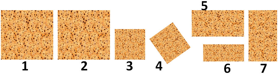 Mehak : Mme Ali, les formes de 1 à 4 sont toutes des carrés et donc similaires. La forme 2 est congruente à la forme 1 et la forme 4 est congruente à la forme 3. La forme 7 est similaire et congruente à la forme 5. Je devrais la mesurer pour m’assurer que la forme 6 est également similaire à 5 et 7.