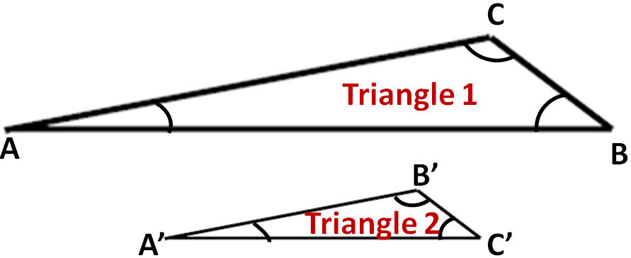 Mme Ali : J’ai dessiné deux triangles similaires – le triangle 1 et le triangle 2. Ils sont similaires parce que l’angle BAC du triangle 1 est égal à B’A’C’ du triangle 2, l’angle ACB est égal à l’angle A’C’B’ et, par conséquent, le troisième angle CBA = C’B’A’. Maintenant, si le rapport des côtés AB du triangle 1 et A’B’ était de deux, qui peut me dire le rapport de BC à B’C’, et de AC à A’C’ ?